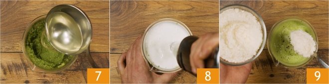 Add a couple of ladles of the cooking water 7 and blend again, then add the cream 8 and grated Parmesan cheese 9. Blend again, adding another ladle of cooking water if necessary until the desired consistency is reached.