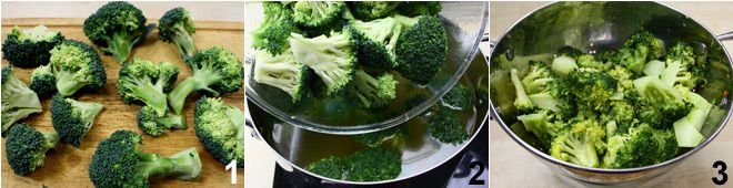 To prepare the broccoli flans, start by cleaning the broccoli: separate the florets from the stalks 1, wash them, and set aside. Peel the stalks and cut them into pieces. Boil the broccoli in plenty of boiling water 2, then drain the vegetables and let them sit in a colander so that all excess water disappears 3.