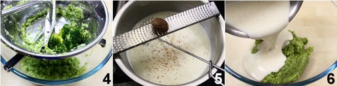 Pass the broccoli through a food mill 4 (except for a few florets to set aside for garnish) and collect the puree in a bowl. Meanwhile, prepare the bechamel by melting the butter in a saucepan, adding the flour, and letting it brown over moderate heat for a few moments; at this point, add the milk and stir over low heat until the sauce thickens, then add salt and grated nutmeg 5, and turn off the heat.