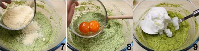 the grated cheese 7 and the two egg yolks 8 (set aside the egg whites); mix the ingredients, then adjust for salt and pepper. Beat the egg whites until stiff peaks form and gently fold them into the broccoli mixture with a rubber spatula 9, being careful not to deflate the preparation.