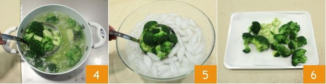 then drain them 4 and place them in a bowl full of ice water 5 to cool them and keep the color vibrant. Once the broccoli have cooled, drain them from the ice water and dry them with a paper towel 6.