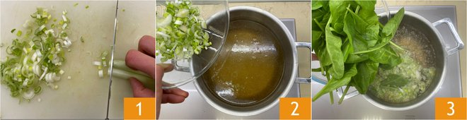 To make the bruschetta with broad beans and herbs, first prepare the Vegetable broth with our recipe and keep it warm. Cut the spring onion in half lengthwise and then into rounds 1. Place the spring onion in the boiling broth 2 and boil it for 3 minutes, then add the previously cleaned herbs 3 and drain immediately. Set aside.
