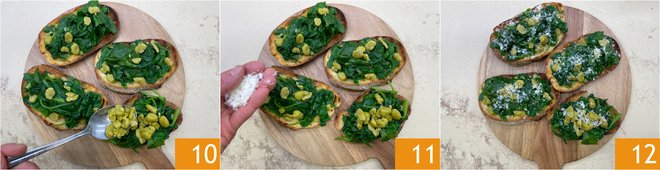 Assemble the bruschetta by spreading the herbs on the bread, then add the broad beans 10 and season each with a teaspoon of oil and a teaspoon of parmesan 11. Your bruschetta with broad beans and herbs is ready to be enjoyed 12!