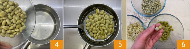 Blanch the broad beans in slightly salted boiling water for one minute 4. Drain 5 and let them cool, then peel them 6.