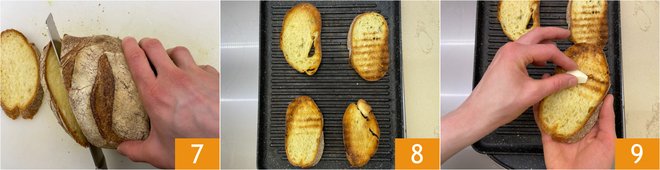 Slice the bread 7 and grill it on a hot griddle 8. Once toasted, rub the bread with garlic 9.