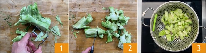 To make the broccoli cream bruschetta, first peel the broccoli stalk with a peeler to remove the tougher outer part 1, then chop it roughly 2. Also chop the leaves into pieces, if present. Steam the stalks and leaves for 10 minutes 3.