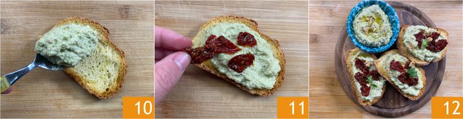 Spread the broccoli cream on the toasted bread slices 10 and garnish as desired with sun-dried tomatoes 11 or anchovies. Your broccoli cream bruschetta is ready to be enjoyed 12!