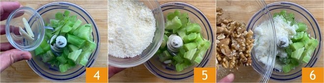 Transfer everything to a blender and add the peeled garlic clove 4, grated Pecorino cheese 5, and walnut kernels 6.