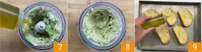 Blend for a few seconds, then add the oil gradually 7 and continue blending until you reach a creamy and smooth consistency 8. Adjust the broccoli cream with salt and pepper. At this point, slice the bread, season with oil 9 and pepper, and toast in the hot oven for a few minutes.
