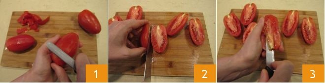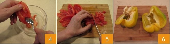 Remove the remaining seeds 4, then slice them thinly and cube them 5. Set the tomatoes aside. Move on to the yellow bell pepper: remove the green stem and cut it in half 6. Remove the internal white filaments and seeds.