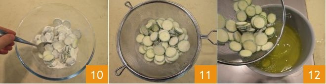 Mix them well in the flour so that it adheres uniformly to the vegetables 10, then transfer them to a sieve to drain excess flour 11 and fry a few at a time in a pan with hot oil (it should not exceed 356°F, you can check with a kitchen thermometer) 12.
