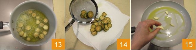 Once they are golden 13, drain them and lay them on a tray lined with paper towels 14 and salt them. Set them aside and meanwhile place a pot with water on the stove to heat for cooking the pasta. When it boils, salt it. Meanwhile, proceed with preparing the sauce. Take a large-bottomed non-stick pan and sauté the garlic 15. If you prefer a more intense flavor, you can also crush it.