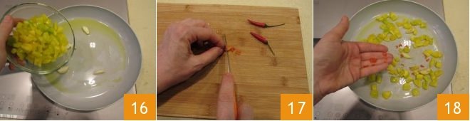 Add the bell peppers 16. Then take one chili pepper, remove the stem and internal seeds, and chop it into pieces 17. Add the chili pepper to the pan as well 18 and let the ingredients brown for 10 minutes. If necessary, add a few ladles of pasta cooking water to allow for even cooking.