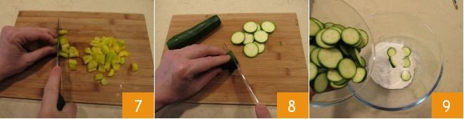 Now slice it into strips and then small cubes 7: set aside. Proceed with the zucchini, trim the ends and slice them into rounds with a thickness of about 1/8 inch 8. Place them in a bowl with flour 9.