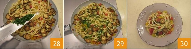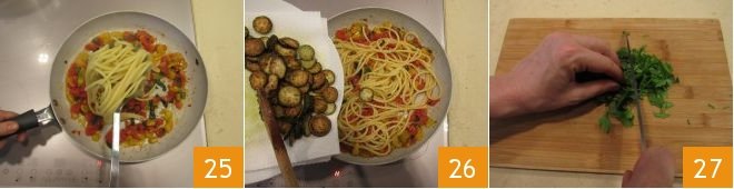 drain them still al dente directly into the pan with the sauce 25. At this point, add the fried zucchini to the pan as well 26. Finely chop the parsley 27