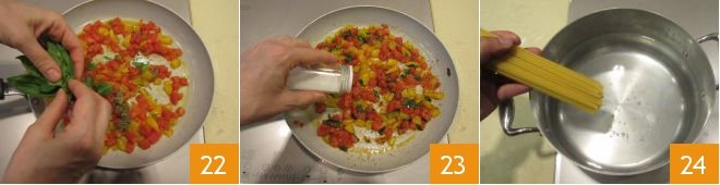 and coarsely torn basil 22, adjusting the salt if necessary 23. Now cook the bucatini 24,