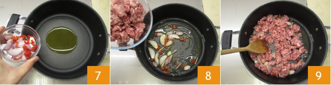 In a pan, heat a swirl of olive oil, add the chopped chili pepper and sliced shallot 7. Sauté for a couple of minutes. Then add the sausage 8, stir 9, and cook for about 10 minutes over medium-high heat.