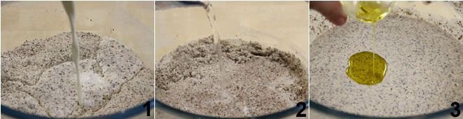 To prepare the basic batter for buckwheat crepes, start by placing the buckwheat flour in a bowl, then add the sifted all-purpose flour and half a teaspoon of salt. Stir with a wooden spoon and then incorporate the milk 1 and water gradually 2. Mix the ingredients well, making sure not to form lumps, and finally add the oil 3