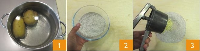 To prepare the buckwheat gnocchetti with Grana Padano PDO and pepper, first boil the potatoes with their skins on 1 for about 30 minutes or until they are soft (the cooking time also depends on the size of your potatoes). Once the potatoes are cooked, pour the flour onto a work surface 2 and mash the still-hot potatoes with their skins in the center with a potato masher 3.