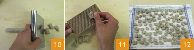 Cut these logs into 1 cm (about 0.39 inch) pieces using a bench scraper or knife 10. Roll each piece on a gnocchi board 11 to create the typical ridges. If you don't have a gnocchi board, you can use the tines of a fork to achieve the same pattern. As you prepare the gnocchi, place them on a tray covered with a tea towel 12. Once you've finished the gnocchi, set a pot of salted water on the stove to boil.