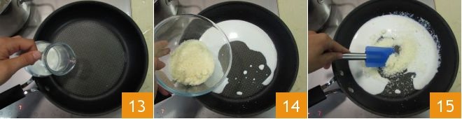 Now, prepare the sauce: pour the milk into a pan 13, bring it to the brink of boiling, and then add the grated Grana Padano PDO 14. Stir to melt the cheese 15.