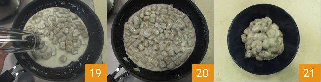 When you have obtained a velvety consistency 16, cook the gnocchi for a few minutes in boiling water 17, and as they rise to the surface, use a slotted spoon to transfer them directly into the pan with the sauce 18.