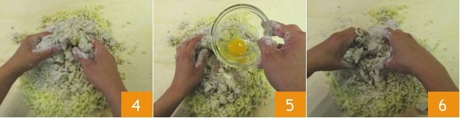 Begin to gather the ingredients with your hands 4, then add the egg 5 and continue to knead vigorously 6 until you obtain a compact dough.