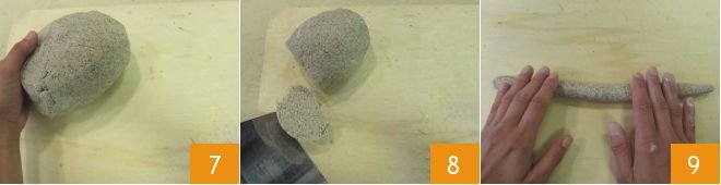 Form a loaf 7. Use a bench scraper to cut portions of dough 8 and shape each into a log 9.