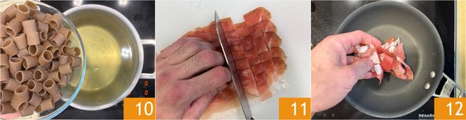 Cook the buckwheat pasta in the same water in which you blanched the vegetables 10. Meanwhile, roughly chop the speck 11 and toast it briefly in a pan 12.