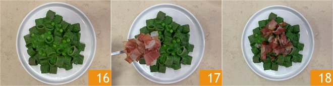 Plate and top with the reserved peas 16 and speck 17. Your buckwheat pasta with pea cream and crispy speck is ready to be served 18!