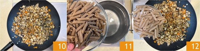 Continue to cook over medium-high heat, stirring often to prevent the ingredients at the bottom of the wok from burning 10. Boil the buckwheat penne in salted boiling water 11. Once ready, drain them and transfer them to the wok 12.