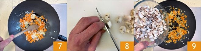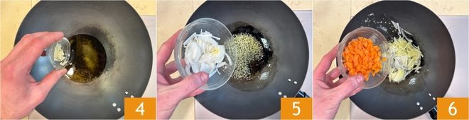 Add to the wok the peeled and finely chopped garlic 4, sliced onion 5, and chopped carrots 6.