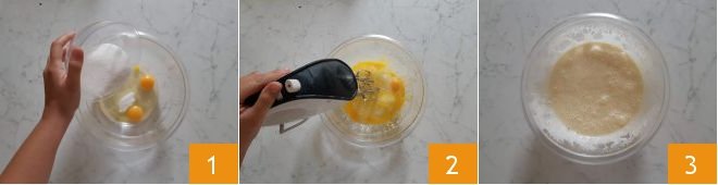 To prepare the buckwheat loaf cake with chocolate chips, start by placing eggs and sugar in a bowl 1 and whisking them with an electric mixer 2 until you have a light and frothy mixture 3.