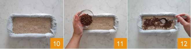 Line the inside of a loaf mold with baking paper, pour the batter 10, then add the chocolate chips on top 11. Stir the chips into the batter with a spoon 12,