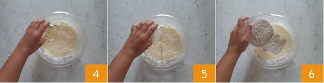 Add oil 4 and milk 5, stirring everything either with a hand whisk. Fold in the flour into the mixture 6