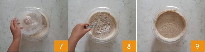 and the sifted baking powder 7. With a hand whisk or a spoon, mix all the ingredients until you have a lump-free batter (8-9).