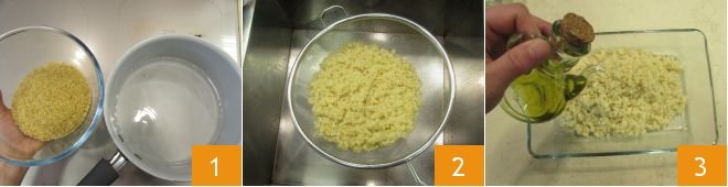 To prepare the bulgur with cherries and goat cheese, first put the water in a large pot, then add the bulgur 1 and a pinch of salt and cook it for 4-5 minutes from boiling. Once cooked, drain the bulgur 2 and transfer it to a bowl; season with a drizzle of oil 3, mix well, and let it cool.