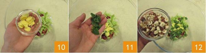 the ginger 10, the torn mint leaves 11, the chopped hazelnuts 12,
