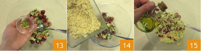 the grated zest of a lime 13, and the now-cooled bulgur 14. Season with a drizzle of oil 15, salt, and pepper,