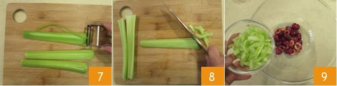 Finally, wash the celery stalks, remove the ends, peel the outer filaments with a peeler 7, and cut them into thin slanted slices 8. Now place the pitted cherries in a bowl and add the celery 9,