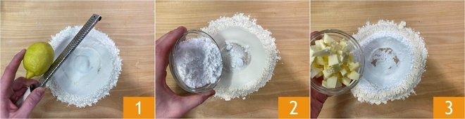 To prepare the bunny cookies, first make the dough. Pour the flour onto the work surface creating the classic fountain shape, then add the zest of one lemon 1, powdered sugar 2, and cubed butter 3.