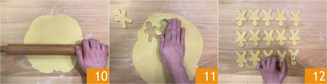 Roll out the dough on a lightly floured work surface 10 and cut out the cookies using a gingerbread man-shaped cutter 11; with these quantities, you will get about 20. Place them upside down, with the head facing down, and place the ball in the center 12. Raise the arms to "hug" the ball, without pressing too hard.
