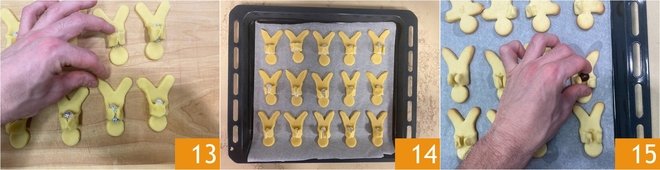 Slightly shape the man's legs to make them pointed so they look like ears 13. Transfer to a baking tray 14 and bake in a preheated static oven at 350°F for 15 minutes. Remove them from the oven and, while they are still warm, carefully remove the aluminum ball. Let them cool completely, then place the chocolate egg in the center 15.