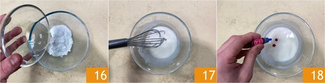 Now prepare the glaze: in a small bowl, pour powdered sugar and water 16, mix with a whisk 17 and add pink food coloring 18.