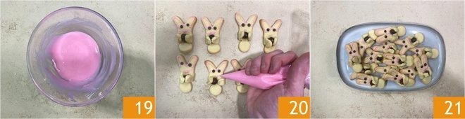Mix again until you obtain a fluid and evenly colored glaze 19. Transfer it to a piping bag and decorate the edges of the bunnies 20. Let the glaze solidify for an hour and serve your bunny cookies 21!