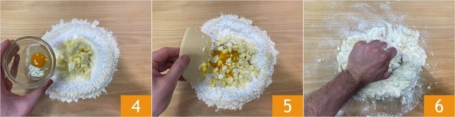 Add the egg 4 and start mixing with a dough scraper 5 and then with your hands 6.
