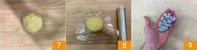 You shouldn't work the dough too much; as soon as it is homogeneous 7, wrap it in plastic wrap 8 and let it rest in the refrigerator for 30 minutes. Then form 30 balls with aluminum foil, the same size as your chocolate eggs 9.