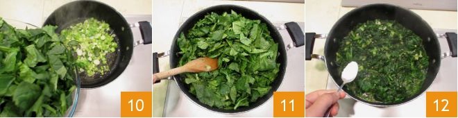 Add the spinach last 11 and let them wilt for 5 minutes with the lid on until they are soft. Then add salt 12 and pepper.