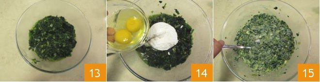 Transfer the cooked spinach into a bowl and let them cool 13. Add the ricotta, eggs 14 to the filling, and mix to combine 15.