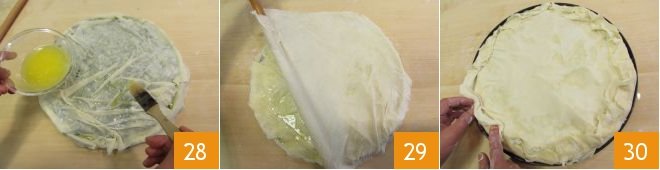 Continue by laying out the remaining sheets, always brushing the surface with melted butter 28. Lay the last sheet 29 and fold the edges to seal well 30.
